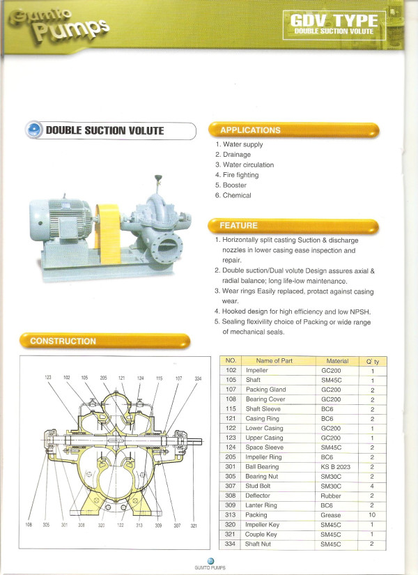 양흡입 보류트 펌프 (GDV TYPE) 페이지 정보 작성자 최고관리자 작성일 15-08-31 15:43 조회 1,064회 댓글 0건 본문 1. 수평 분할 구조입니다. 2. 양정에 비해 많은 유량입니다. 3. 웨어링을 갖고 있어 유지관리가 용이합니다. 4. 상부케이싱을 분해하고 회전체를 점검 할 수 있습니다. - 용 도 1. 상수로 설비용 2. 일반 산업용 3. 농업용 4. 배수용 이전글다단 터빈 펌프 (GTP TYPE) 다음글스텐보류트 펌프(GPP TYPE) 목록