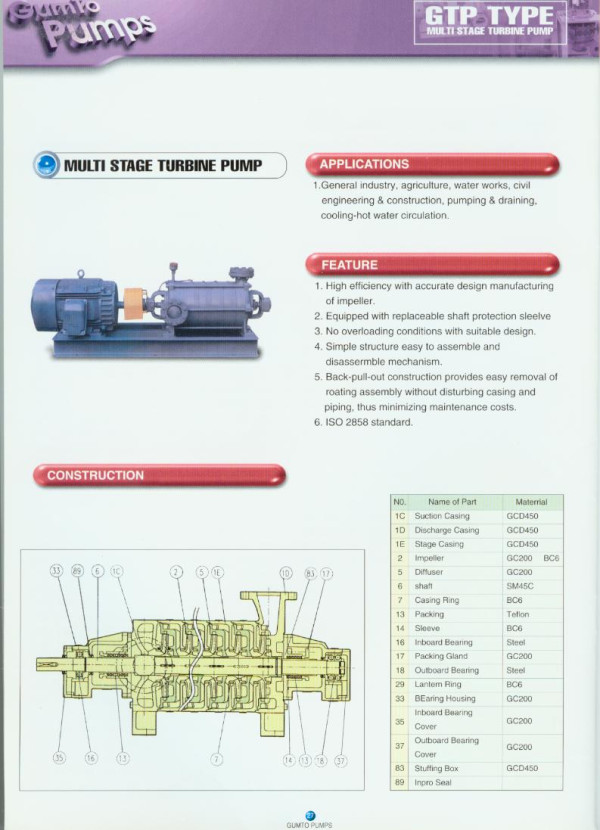다단 터빈 펌프 (GTP TYPE) 페이지 정보 작성자 최고관리자 작성일 15-08-31 15:47 조회 1,194회 댓글 0건 본문 1. 압력이 높고 소음 진동이 적습니다. 2. 가이드벤이 있는 구조로 효율이 높습니다. 3. 구조가 간단하고 분해 조립이 용이합니다. - 용 도 1. 고층지대 및 빌딩 2. 소화전용 3. 일반 산업용 4. 보일러 급수용 이전글입형 펌프(VSE TYPE) 다음글양흡입 보류트 펌프 (GDV TYPE) 목록