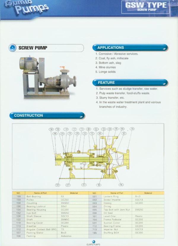 SCREW PUMP(MODEL SW 2000 TYPE) 페이지 정보 작성자 최고관리자 작성일 15-08-31 15:57 조회 969회 댓글 0건 본문 1. 특수 설계에 의한 스크류 부분과 원심부분이 복합된, 하나의 임펠러로 구성된 펌프로서, 섬유질 혹은 고형물의 이송에 적합하다. 2. 용적형 스크류 펌프와 원심펌프의 원리가 동시에 적용된 펌프로, 기존 논클로그 펌프의 단점을 개선시켜 효율이 좋은 에너지 절약형 펌프이다. 3. 양정 곡선이 급경사로 되어 있어 유량 조절이 용이하다. - 용도 각종 수처리분야(여과되지 아니한 하수, 오수, 폐수, 오니 처리분야), 제지, 피혁, 식품, 석유, 금속제, 유지공업, 제당, 주정, 전분, 요업, 건설, 광업, 축산업(우사, 돈사), 수산업(각종 선어 각종 어획) 다음글SUPPORT PUMP(MODEL SU 2000 TYPE) 목록