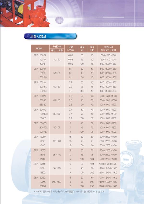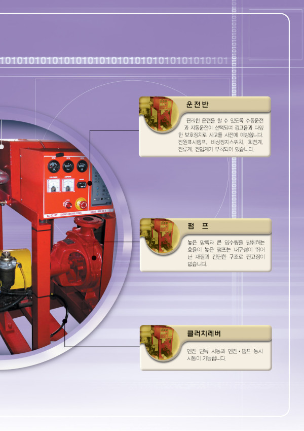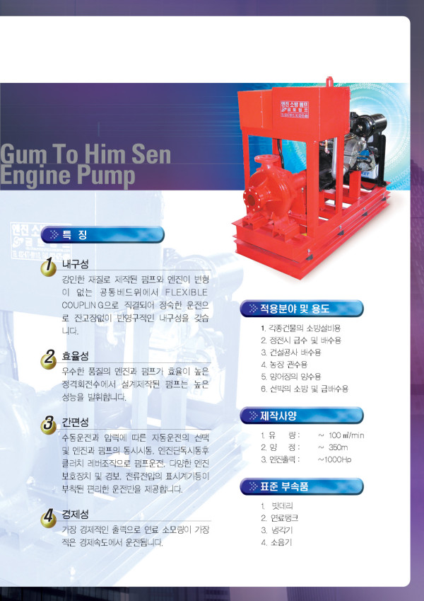 엔진 소방 펌프 페이지 정보 작성자 최고관리자 작성일 15-08-31 11:38 조회 1,398회 댓글 0건 본문 1. 내구성 강인한 재질로 제작된 펌프와 엔진이 변형이 없는 공통베드위에서 flexible coupling으로 직경되어 정숙한 운전으로 잔고장이 없이 반영구적인 내구성을 갖습니다. 2. 효율성 우수한 품질의 엔진과 펌프가 효율이 높은 정격회전수에서 설계제작된 펌프는 높은 성능을 발휘합니다. 3. 간편성 수동운전과 압력에 따른 자동운전의 선택 및 엔진과 펌프의 동시시동, 엔진단독시동후 클러치 레버조작으로 펌프운전, 다양한 엔진 보호장치 및 경보, 전류전압의 표시계기등이 부착도니 편리한 운전반을 제공합니다. 4. 경제성 가장 경제적인 출력으로 연료 소모량이 가장 적은 경제속도에서 운전됩니다. - 용 도 1. 각종건물의 소방설비용 2. 정전시 급수 및 배수용 3. 건설공사 배수용 4. 농장 관수용 5. 양어장의 양수용 6. 선박의 소방 및 급배수용 목록